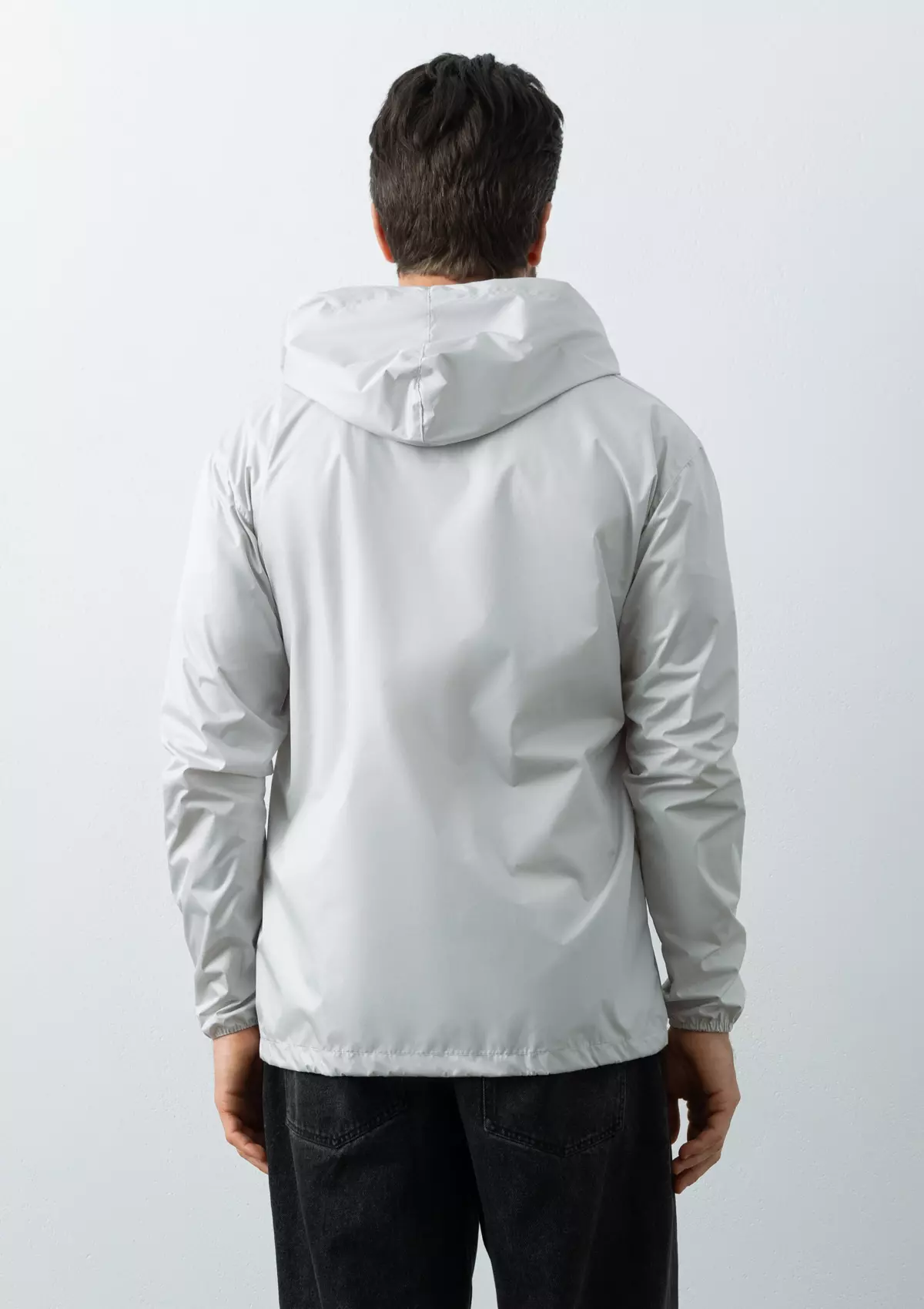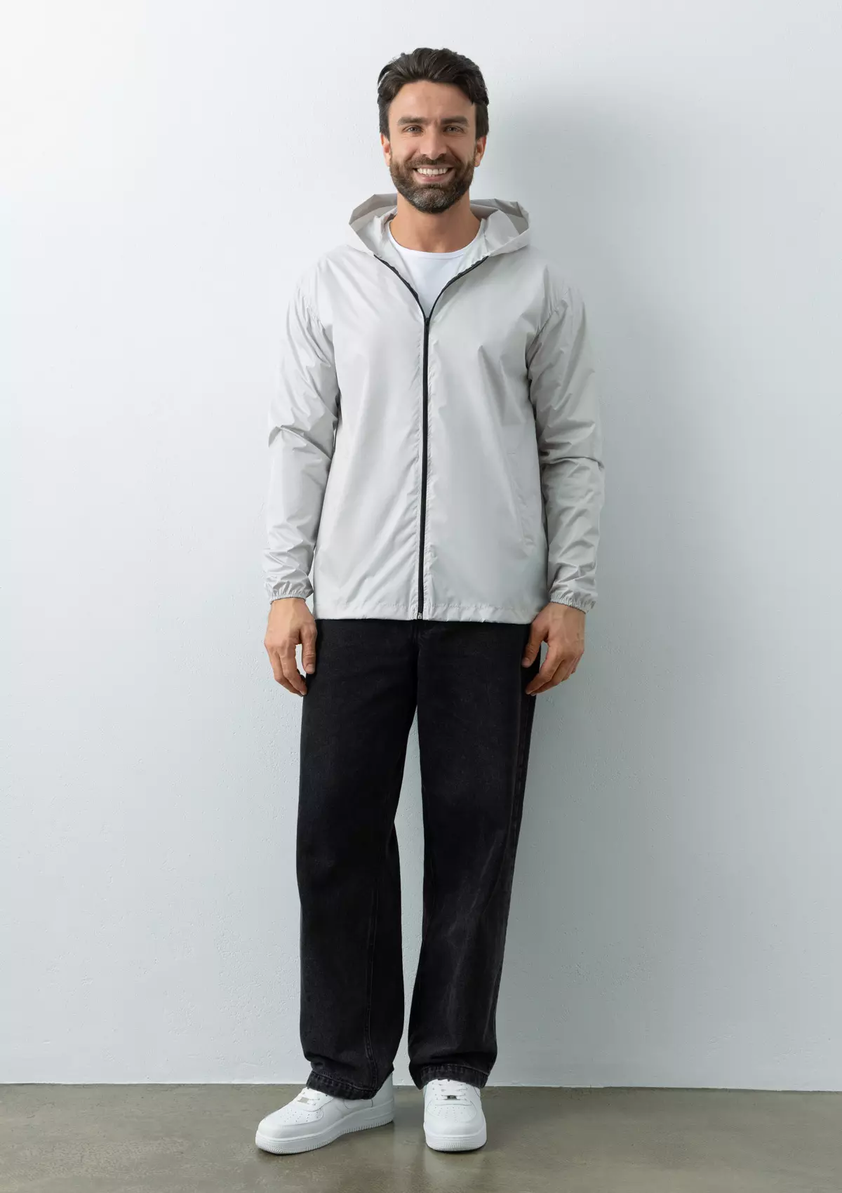 Ветровка прямого силуэта с глубоким капюшоном, спущенной линией плеча, прорезным карманом и застежкой на молнию. Для дополнительной защиты от ветра изделие дополнено эластичной резинкой на рукаве и кулисой по линии низа.