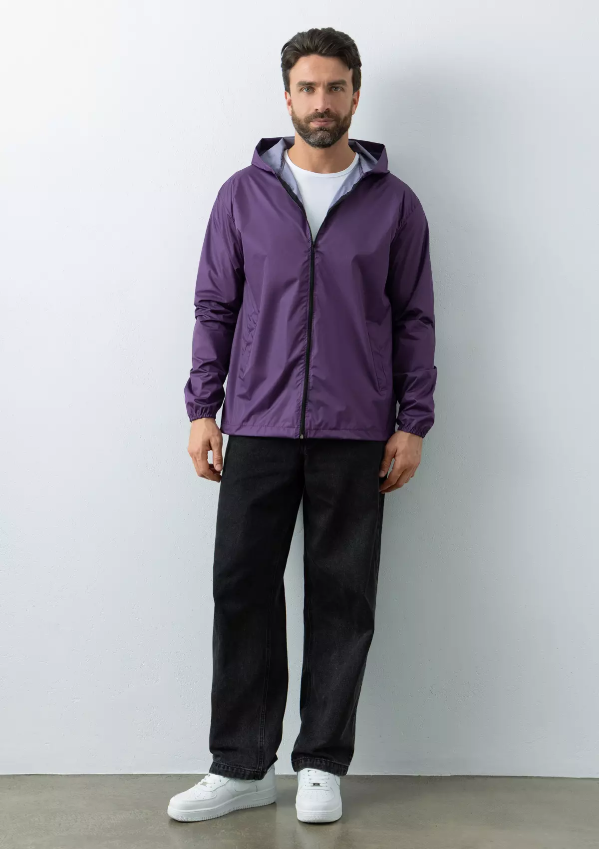 Ветровка прямого силуэта с глубоким капюшоном, спущенной линией плеча, прорезным карманом и застежкой на молнию. Для дополнительной защиты от ветра изделие дополнено эластичной резинкой на рукаве и кулисой по линии низа.