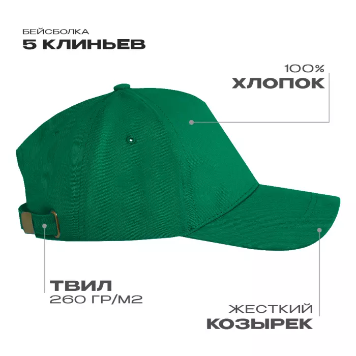 Бейсболка-пятиклинка с вышитыми люверсами, классическим изогнутым козырьком и прочной застежкой на металлический замок. Благодаря особенностям кроя изделие оптимально для большинства технологий нанесения.