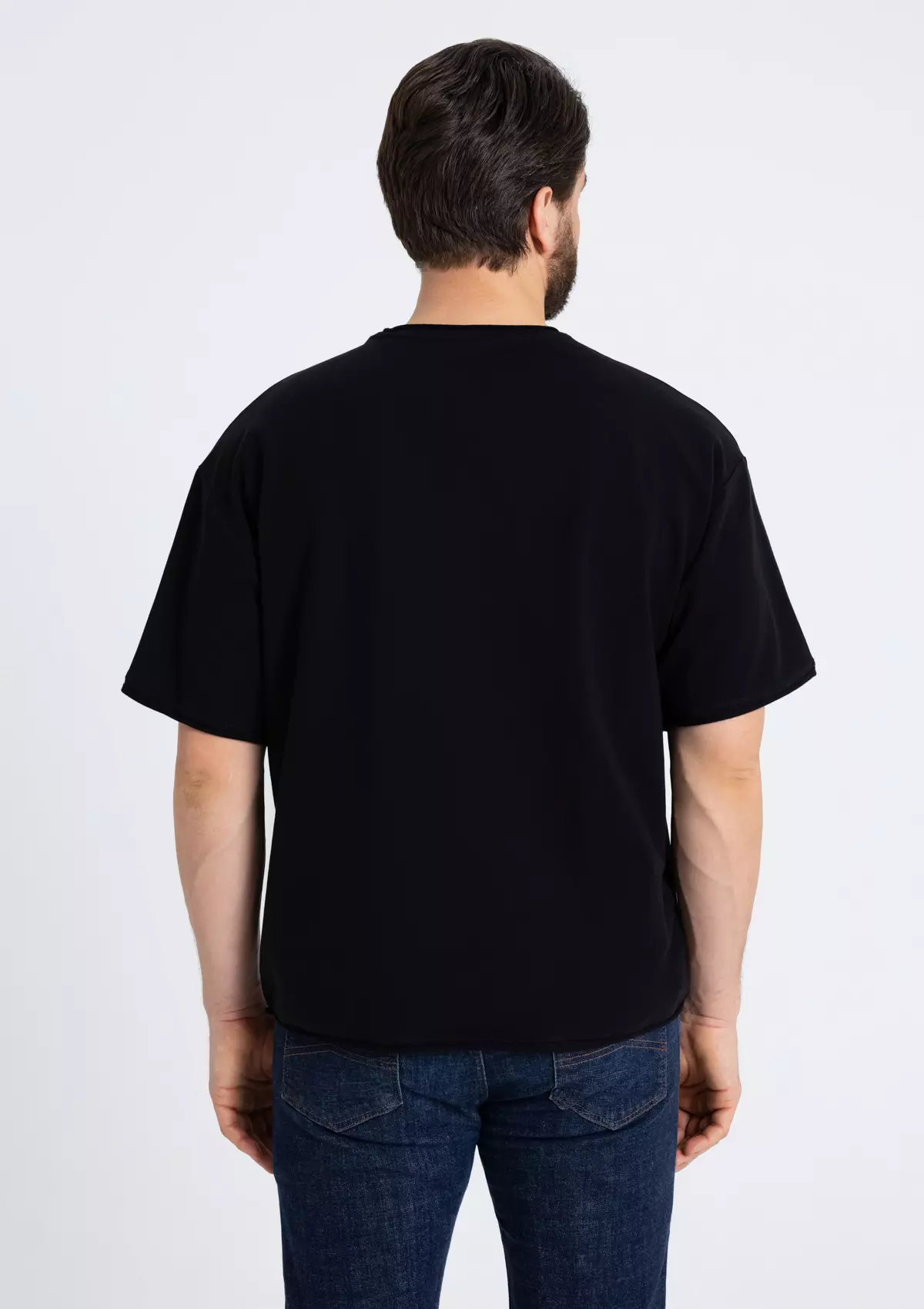 Футболка оверсайз-силуэта со спущенной линией плеча и необработанным краем рукава, горловины и по низу изделия.