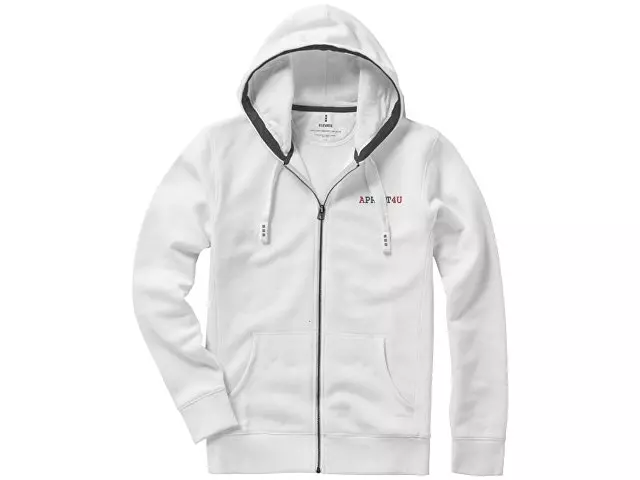 Свитер Arora с капюшоном и застежкой-молнией на всю длину. Стандартный покрой. Резинка 2х2 на боковых вставках, поясе и манжетах. Карман кенгуру. Мужская и женская модели с завязками на капюшоне. Подкладка внутри капюшона. Подкладка на полумесяце. Атласная лента внутри горловины. Принт лого сзади в тон изделия. Серебристые люверсы с лого. Трикотаж: 80% хлопок и 20% полиэстер, чесаная внутренняя сторона. 300 г/м².