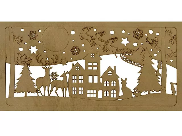 Настенный перекидной календарь имеет необычную «обложку», в роли которой выступают фанерные крышки. Нижняя крышка сплошная, верхняя — резная, ажурная, с вырезанным новогодним пейзажем и большим полем под нанесение логотипа или надписи, которая органично впишется в облик календаря. Квартальный блок календаря изготовлен из офсетной бумаги 90 грамм и включает в себя 12 листов. Каждый лист содержит крупный календарь на текущий месяц и два малых на предшествующий и будущий соответственно, что очень удобно для планирования. В комплект входит красный курсор-бегунок для выделения текущей даты.
