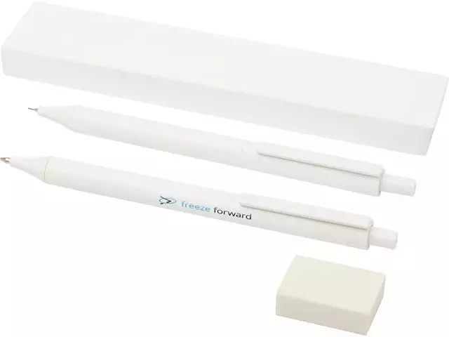 Комплект антибактериальных канцелярских принадлежностей, состоящий из шариковой ручки с нажимным механизмом, механического карандаша и ластика. Нанопорошковая добавка уменьшает рост микроорганизмов на поверхности ручек.
