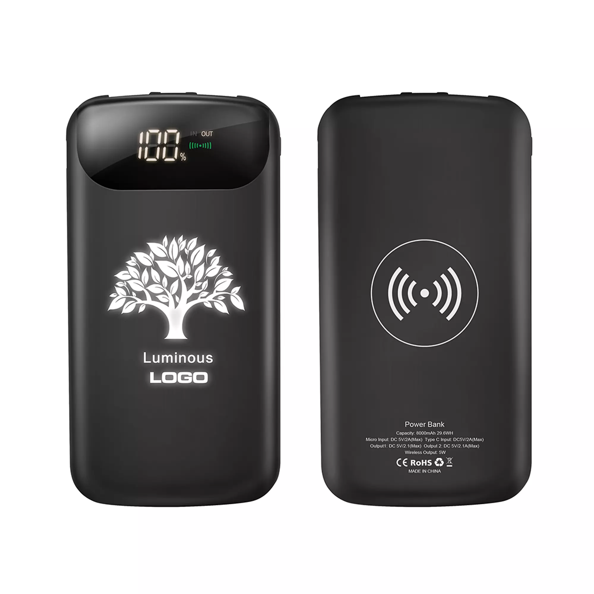 Беспроводное зарядное устройство 8000mAh с подсветкой (белая) логотипа и цифровым индикатором заряда, soft touch, чёрное