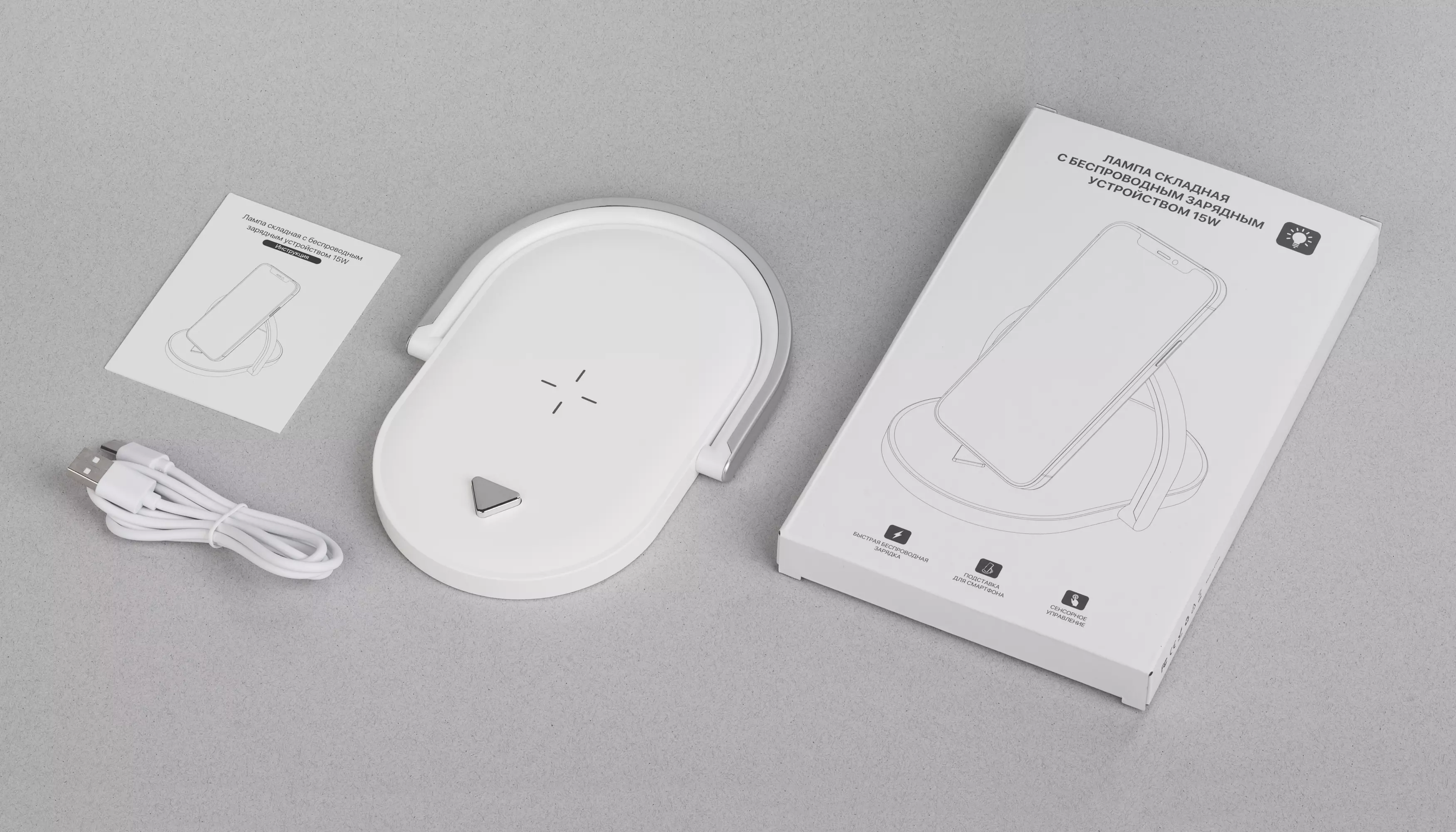 Многофункциональный гаджет: БЫСТРОЕ 15W беспроводное зарядное устройство + складная лампа-ночник + подставка для смартфона. 3 режима освещения с функцией регулировки яркости в каждом из режимов при помощи сенсорной кнопки, расположенной посередине ободка лампы. У треугольной кнопки 2 положения – она может быть «утоплена» вровень с плоскостью зарядного блока (для удобного размещения гаджетов для зарядки) или быть выше поверхности зарядного блока (использование её в качестве подставки для смартфона). Характеристики: Вход (Type-C input): DC 5V/3A, 9V/2A, 12V/1.5A (Max) Выход (Wireless output): 5W/7.5W/10W/15W Эффективность беспроводной зарядки: >75% Рабочая дистанция для передачи заряда: 8 мм (Max) Материал: ABS-пластик, полипропилен Длина кабеля USB / Type-C 100 см