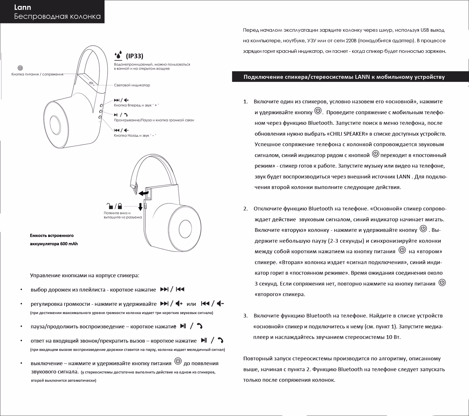 Беспроводная колонка Lann совмещает хорошие акустические параметры с популярными функциями этого класса устройств: выходная мощность 5 ватт тип элемента питания: литиевый, емкость 600 mAh управление воспроизведением кнопками на корпусе устройства, регулировка громкости функция ответа на звонок/завершения вызова герметичный корпус, обеспечивающий защиту от влаги на уровне IP33 шнур с разъемом для зарядки интегрирован в корпус, его невозможно потерять или забыть удобное крепление - кабель образует проушину, за которую колонку можно подвесить, зафиксировать Вес устройства: 140 г
