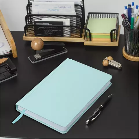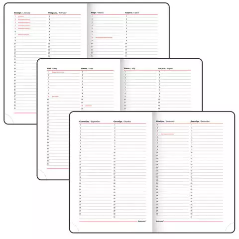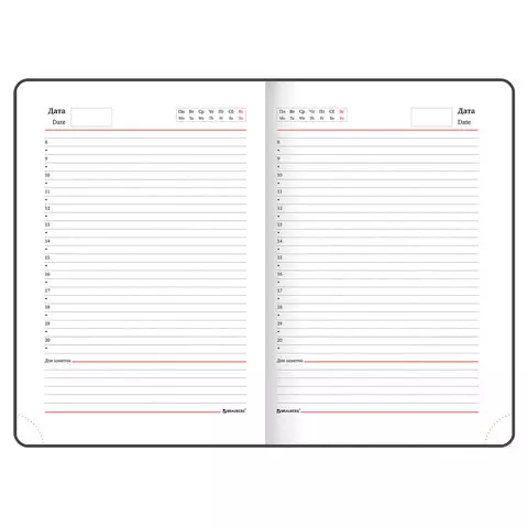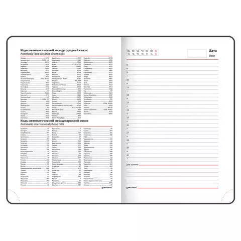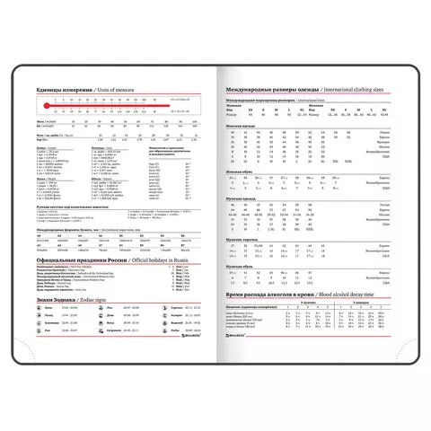 Внутренний блок включает 136 листов белой бумаги плотностью 70 г/м2. Каждая страничка имеет перфорированный угол. Благодаря стандартному формату А5 (138х213 мм) ежедневник удобно использовать как в офисе, так и на выездных деловых встречах. Жесткая книжная обложка с легкой рельефной фактурой напоминает натуральную кожу. Материал обложки, балакрон, подходит для тиснения только фольгой. Форзац ежедневника представлен картами мира и России. Дополнением является закладка-ляссе, с помощью которой при необходимости можно быстро открыть ежедневник на нужной странице. Помимо прочего ежедневник снабжен обширным справочным материалом.