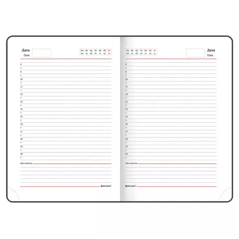 Внутренний блок включает 160 листов белой бумаги плотностью 70 г/м2. Каждая страничка имеет перфорированный угол. Благодаря стандартному формату А5 (138x213 мм) ежедневник удобно использовать как в офисе, так и на выездных деловых встречах. Твердая обложка, стилизованная под гладкую кожу, подходит для горячего тиснения. Снабжен магнитной застежкой, благодаря чему ежедневник не откроется в сумке или портфеле. Форзац ежедневника представлен картами мира и России. Дополнением является закладка-ляссе, с помощью которой при необходимости можно быстро открыть ежедневник на нужной странице. Помимо прочего ежедневник снабжен справочным материалом. Выполнен в комбинации из двух цветов - красный и черный.