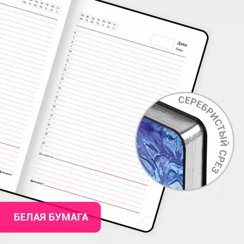Внутренний блок включает 136 листов белой бумаги плотностью 70 г/м2. Благодаря стандартному формату А5 ежедневник удобно использовать как в офисе, так и на выездных деловых встречах. Интегральная (мягкая) обложка с полноцветной печатью и тиснением серебряной фольгой делает ежедневник неповторимым и запоминающимся. Срез ежедневника фольгирован серебряной фольгой, что придает ему особый шарм. Дополнением является закладка-ляссе, с помощью которой можно быстро открыть ежедневник на нужной странице.