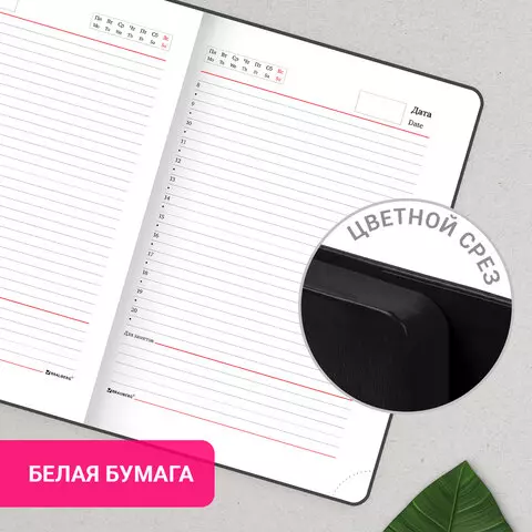 Внутренний блок включает 160 листов белой бумаги плотностью 70 г/м2. Каждая страничка имеет перфорированный угол. Благодаря стандартному формату А5 ежедневник удобно использовать как в офисе, так и на выездных деловых встречах. Интегральная (мягкая) обложка, выполненная в классическом черном цвете и стилизованная под гладкую кожу, фиксируется магнитным клапаном, поэтому ежедневник не откроется в сумке или портфеле и страницы не помнутся. Подходит для горячего тиснения. Дополнением является закладка-ляссе, с помощью которой при необходимости можно быстро открыть ежедневник на нужной странице. Помимо прочего ежедневник снабжен обширным справочным материалом.
