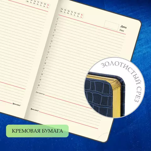 Внутренний блок включает 160 листов тонированной бумаги плотностью 70 г/м2. Каждая страничка имеет перфорированный угол. Благодаря стандартному формату А5 ежедневник удобно использовать как в офисе, так и на выездных деловых встречах. Твердая обложка, стилизованная под кожу крокодила, подходит для горячего тиснения. Срез ежедневника фольгирован под "золото", что придает ему особый шарм. Дополнением является закладка-ляссе, с помощью которой при необходимости можно быстро открыть ежедневник на нужной странице. Помимо прочего ежедневник снабжен обширным справочным материалом.