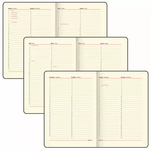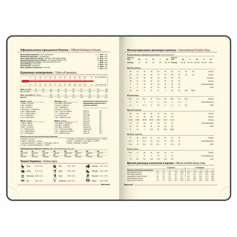Внутренний блок включает 160 листов белой бумаги плотностью 70 г/м2. Каждая страничка имеет перфорированный угол. Благодаря большому формату В5 ежедневник удобно использовать как в офисе, так и на выездных деловых встречах. Твердая обложка, стилизованная под кожу крокодила, подходит для горячего тиснения. Дополнением является закладка-ляссе, с помощью которой при необходимости можно быстро открыть ежедневник на нужной странице. Помимо прочего ежедневник снабжен обширным справочным материалом.