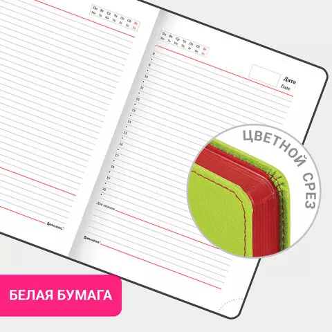 Внутренний блок включает 136 листов белой бумаги плотностью 70 г/м2. Благодаря стандартному формату А5 ежедневник удобно использовать как в офисе, так и на выездных деловых встречах. Интегральная обложка стилизована под гладкую кожу и прошита по периметру. Подходит для горячего тиснения. На внутренней стороне задней обложки есть декоративный конверт для разных мелочей в виде визиток, напоминалок или других милых и полезных мелочей. Срез и форзац ежедневника окрашены в контрастный цвет с обложкой, что придает ему особый шарм. Дополнением являются две закладки-ляссе, с помощью которых можно быстро открыть или зафиксировать ежедневник на нужной странице, а также держатель для ручки на контрасте с обложкой.