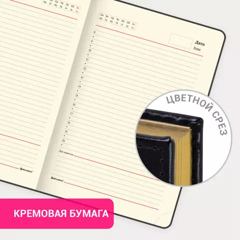 Внутренний блок включает 160 листов тонированной бумаги плотностью 70 г/м2. Каждая страничка имеет перфорированный угол. Благодаря стандартному формату А5 ежедневник удобно использовать как в офисе, так и на выездных деловых встречах. Твердая обложка стилизована под старинную кожу, подходит для горячего тиснения. Срез ежедневника фольгинирован золотой фольгой, что придает ему особый шарм. Дополнением является закладка-ляссе, с помощью которой при необходимости можно быстро открыть ежедневник на нужной странице. Помимо прочего ежедневник снабжен обширным справочным материалом.