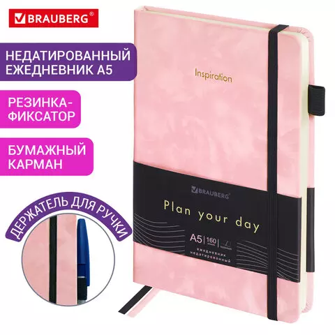 Ежедневник недатированный А5 138x213мм BRAUBERG Velvet, резинка, держатель, 160л, розовый, 116246