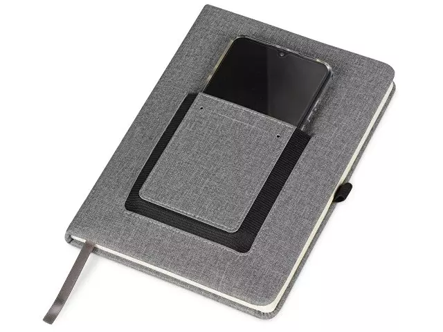 Стильный современный блокнот формата А5. На передней обложке расположен удобный карман для мобильного телефона, бумаг и визиток. Специальная подкладка обложки делает блокнот мягким на ощупь. Покрытие обложки имитирует текстуру текстиля, не скользит и отлично подходит для нанесения логотипа.