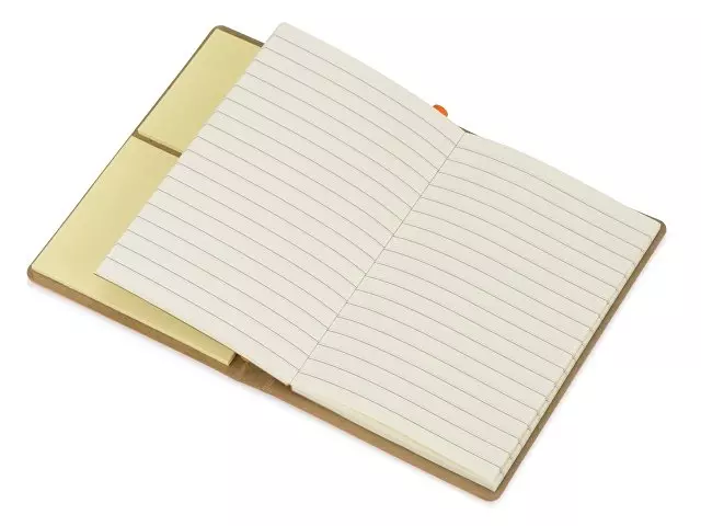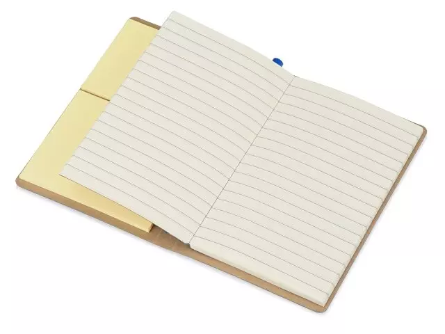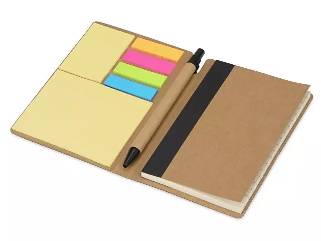 Компактный набор включает в себя разноцветные стикеры разных размеров, блокнот с линованной бумагой и ручку c корпусом из переработанного картона. Обложка выполнена из фактурной искусственной кожи, которая, при тиснении, меняет цвет на более глубокий.