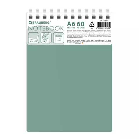 Блокнот МАЛЫЙ ФОРМАТ А6 60л, BRAUBERG, силиконовый гребень, обложка пластик, клетка, зеленый, 117564