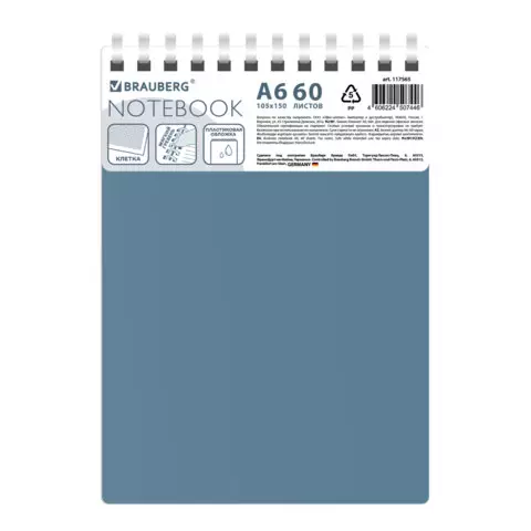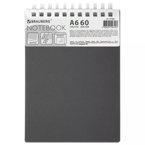 Блокнот МАЛЫЙ ФОРМАТ А6 60л, BRAUBERG, силиконовый гребень, обложка пластик, клетка, серый, 117566