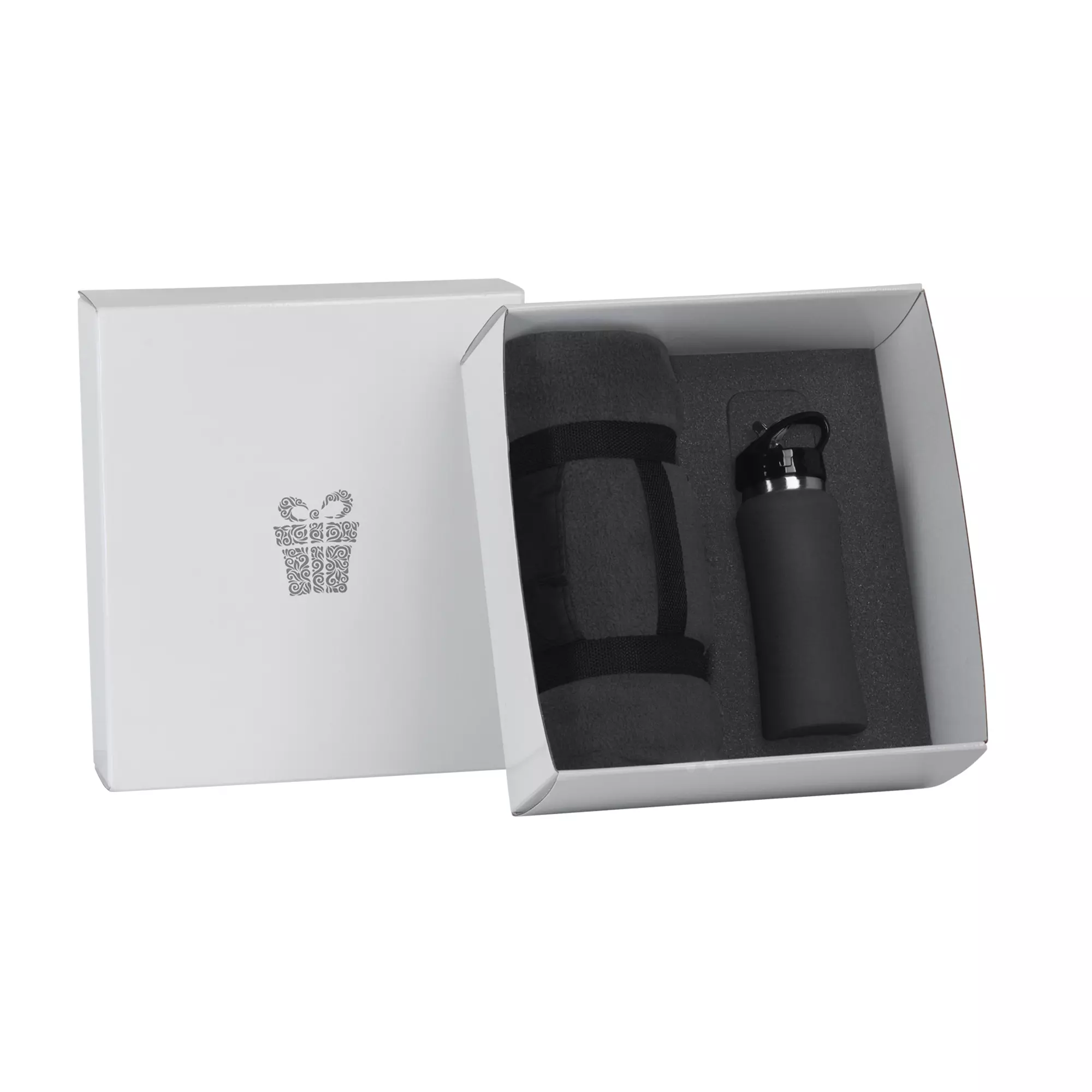 В набор входят: арт. 7803 бутылка спортивная "Индиана" с покрытием soft touch;  арт. 8376 плед "Байкал";  коробка подарочная с ложементом.