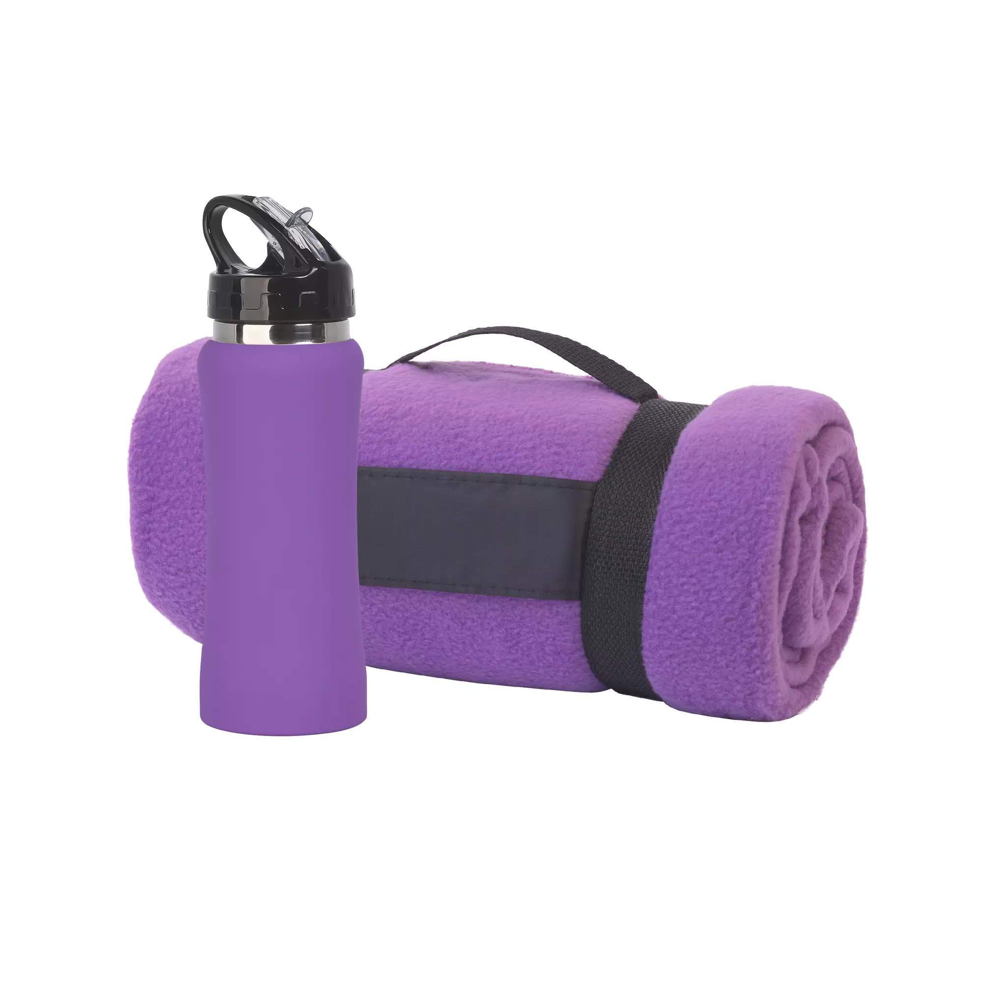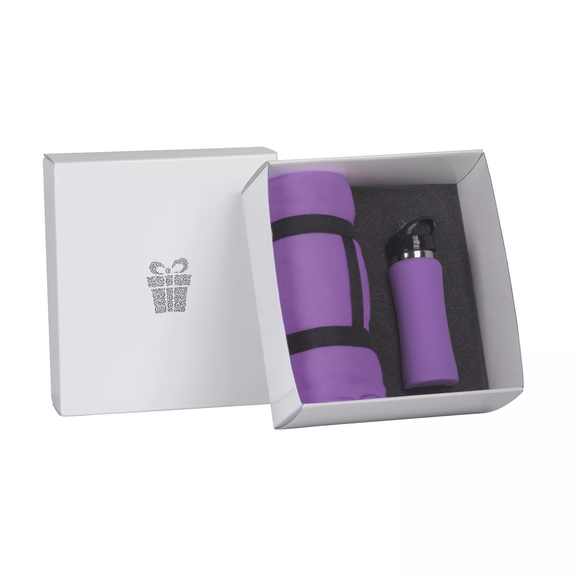В набор входят: арт. 7803 бутылка спортивная "Индиана" с покрытием soft touch; арт. 8376 плед "Байкал"; коробка подарочная с ложементом.