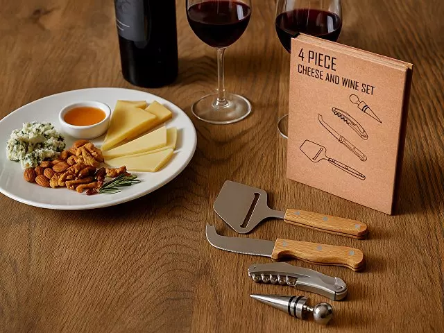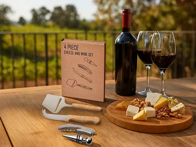 Для бургундцев среди нас мы представляем набор для вина и сыра. В этот комплект входят слайсер и нож для нарезки сыра, штопор и винная пробка.