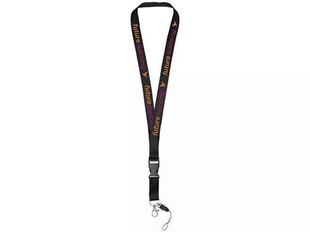 Многофункциональный шнурок с отстегивающейся пряжкой, овальным крючком с зажимом и держателем для телефона. Идеально подходит для бейджа, удостоверения личности или ключей. Предлагается широкий выбор цветов с большим участком для нанесения логотипа. Полиэстер.