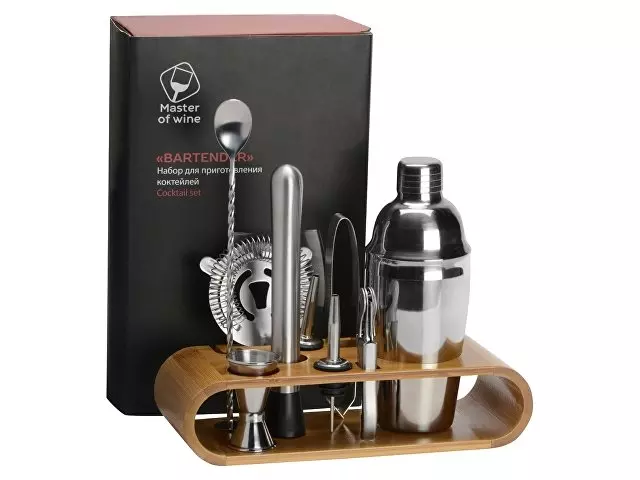 Роскошный подарок для всех, кто любит самостоятельно миксовать коктейли и устраивать незабываемые вечеринки! В наборе Bartender есть абсолютно все, что необходимо для приготовления любых коктейлей: - бамбуковая подставка, - барная ложка, - джиггер 15/30 мл, - гейзер (2 шт.) или дозатор для бутылок, - мадлер или пестик - толкушка для выдавливания сока из фруктов и ягод, - штопор, - стрейнер или ситечко/фильтр, - щипцы для льда, - шейкер 550 мл.