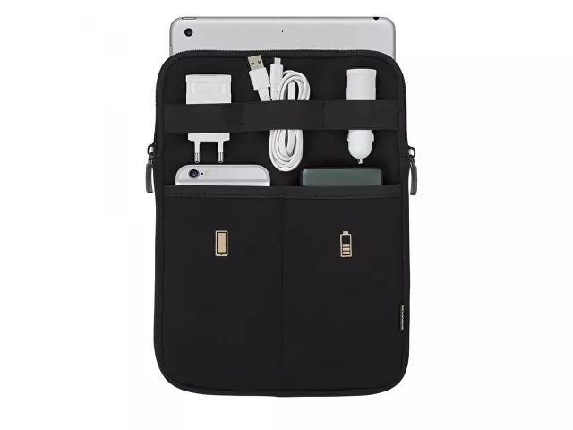 Чехол для планшета и хранения аксессуаров. Основное отделение подходит для большинства 7-8' планшетов 1 сетчатый карман на молнии для мелких предметов 1 внешний карман 1 внешний карман с петлями для кабелей 3 эластичные петли для кабелей Материал: неопрен, полиэстер Цвет: черный Внутренний размер: 155 x 230 x 20 мм. Внешний размер: 175 x 250 x 25 мм.