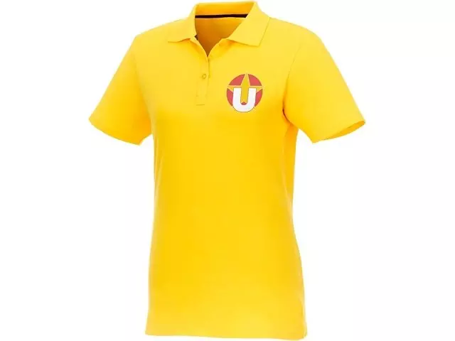 Женское поло Helios с коротким рукавом. Женская модель с разрезами по бокам. Отрезной-отрывной ярлык для комфорта. Воротник гладкой вязкой в рубчик. Планка с тремя пуговицами. Двойная строчка на воротнике и внизу изделия. Пуговицы в цвет изделия. Полоска на горловине в контрастном цвете. Трикотаж Piqué, 100 % хлопок. 180 г/м².