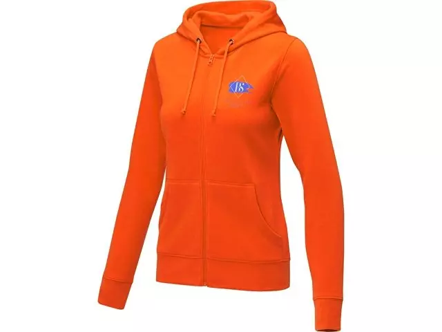 Женская толстовка на молнии Theron. Возможность индивидуального брендинга. Основная этикетка, которую можно оторвать или отрезать, без неудобных пришитых ярлыков. Завязки на капюшоне. Расположенная по центру молния. Карман «кенгуру». С подшивкой из гладкого трикотажа в рубчик. С манжетами из гладкого трикотажа в рубчик. Внутренняя сторона покрыта ворсом. Самоклеющаяся лента на воротнике. Придающие форму швы и зауженная талия для ровного прилегания. Трикотаж 50% Хлопок, 50% Полиэстер, 240 g/m2.