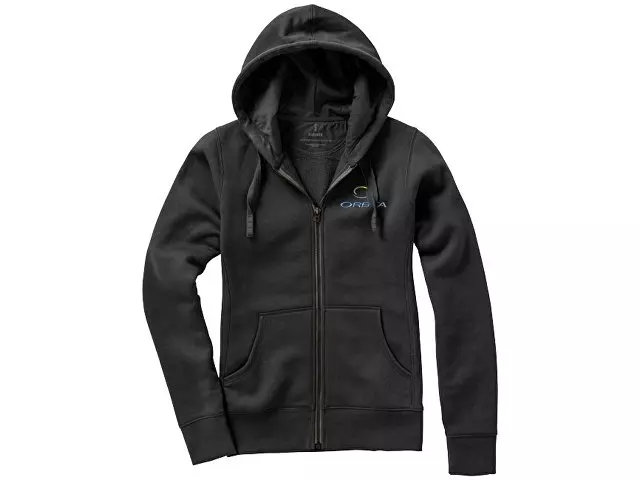 Женский свитер Arora с капюшоном и застежкой-молнией на всю длину. Стандартный покрой. Резинка 2х2 на боковых вставках, поясе и манжетах. Карман кенгуру. Мужская и женская модели с завязками на капюшоне. Подкладка внутри капюшона. Атласная лента внутри горловины. Принт лого сзади в тон изделия. Серебристые люверсы с лого. Ворсистый внутри для мягкости, тепла и комфорта. Трикотаж: 80% хлопок и 20% полиэстер, чесаная внутренняя сторона. 300 г/м².