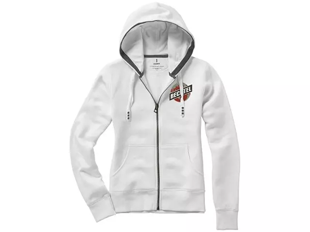 Женский свитер Arora с капюшоном и застежкой-молнией на всю длину. Стандартный покрой. Резинка 2х2 на боковых вставках, поясе и манжетах. Карман кенгуру. Мужская и женская модели с завязками на капюшоне. Подкладка внутри капюшона. Атласная лента внутри горловины. Принт лого сзади в тон изделия. Серебристые люверсы с лого. Ворсистый внутри для мягкости, тепла и комфорта. Трикотаж: 80% хлопок и 20% полиэстер, чесаная внутренняя сторона. 300 г/м².