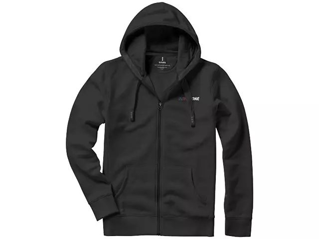 Свитер Arora с капюшоном и застежкой-молнией на всю длину. Стандартный покрой. Резинка 2х2 на боковых вставках, поясе и манжетах. Карман кенгуру. Мужская и женская модели с завязками на капюшоне. Подкладка внутри капюшона. Подкладка на полумесяце. Атласная лента внутри горловины. Принт лого сзади в тон изделия. Серебристые люверсы с лого. Трикотаж: 80% хлопок и 20% полиэстер, чесаная внутренняя сторона. 300 г/м².