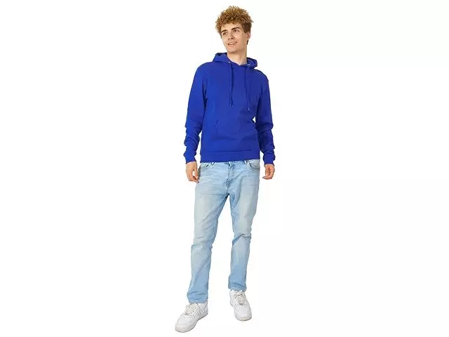 Толстовка с капюшоном (худи) из плотного футера с мягким начесом, с небольшим добавлением полиэстера. Удобная и практичная модель, подходит для прогулок по городу, активного отдыха, путешествий. • Прямой силуэт. • Капюшон с подкладкой в цвет основного материала, металлическими люверсами и плоским шнурком с наконечниками. • Удобный карман-кенгуру. • Долго сохраняет форму и не мнется благодаря небольшому содержанию полиэстера. • Гигроскопичное волокно, обладает хорошими гигиеническими свойствами. • Низ толстовки, рукавов и горловины обработаны рибом (резинкой) 1x1.