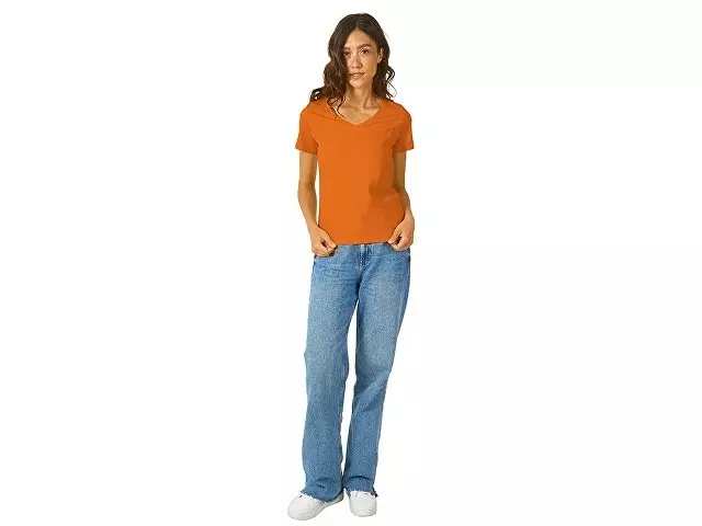 Женская футболка из натурального хлопка с элегантным V-образным вырезом. Материал отлично подходит для нанесения рекламной информации. Натуральная ткань не вызывает раздражения кожи.