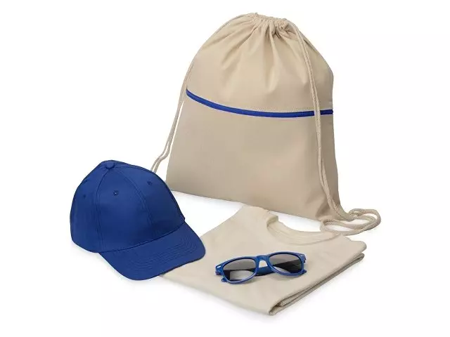 рюкзак- натуральный/синий, футболка- натуральный, бейсболка- синий, очки- синий