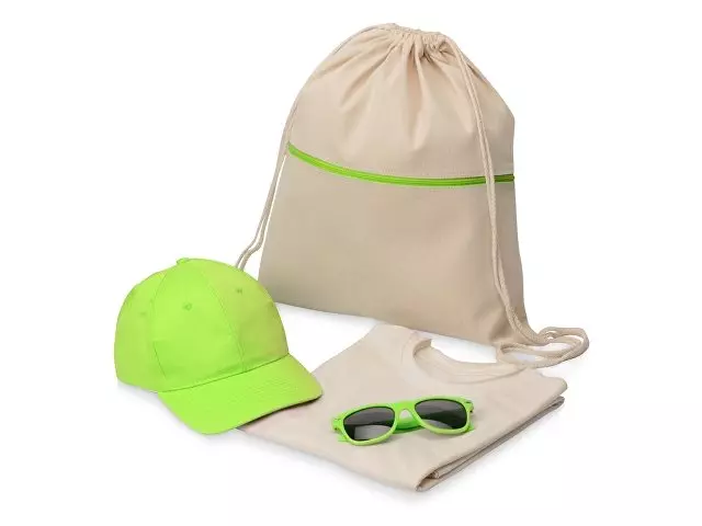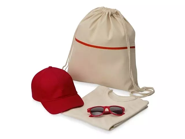 Набор для прогулок и активного отдыха. Набор состоит: - Рюкзак-мешок «Lark» хлопковый с цветной молнией; - Очки солнцезащитные «Sun ray»; - Бейсболка «Detroit»; - Футболка «Pure» из неокрашенного хлопка, мужская.