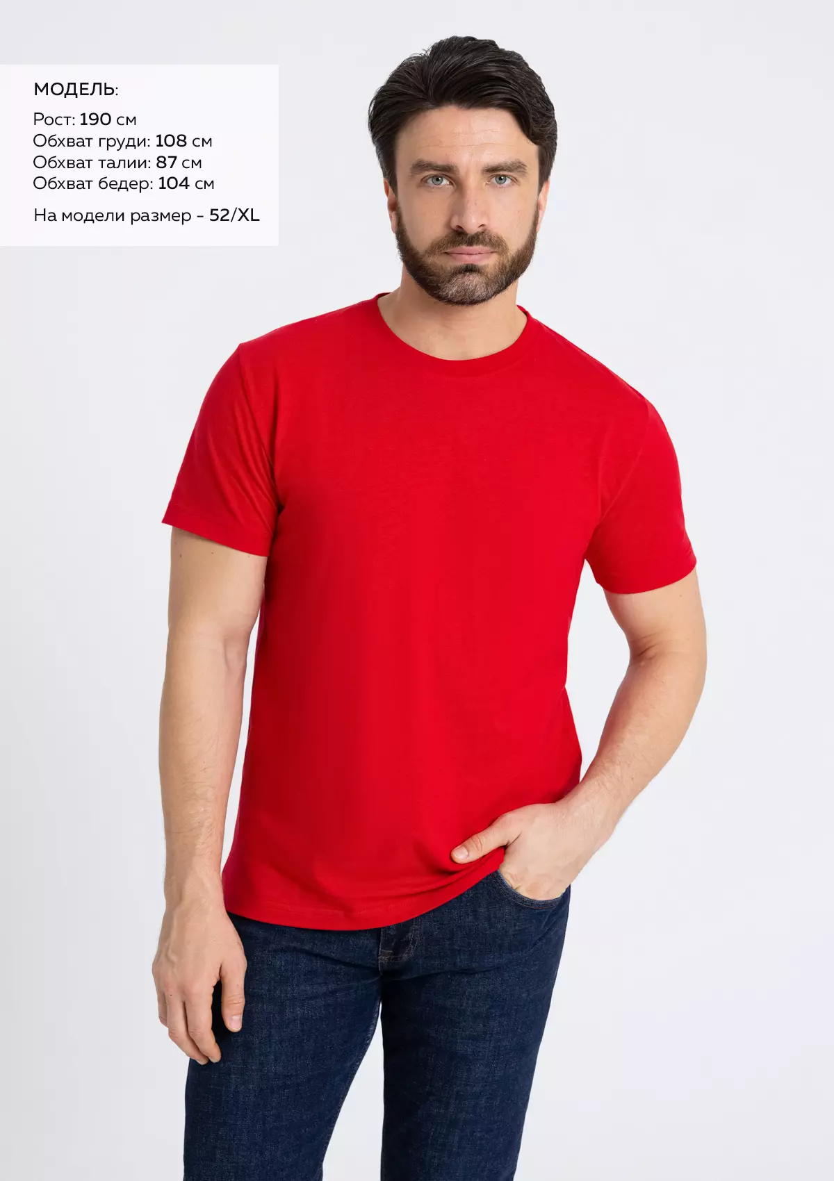Размер мужской футболки: 52/XL. Параметры модели: рост 190 см.; обхват груди 108 см.; обхват талии 87 см.; обхват бедер 104 см.