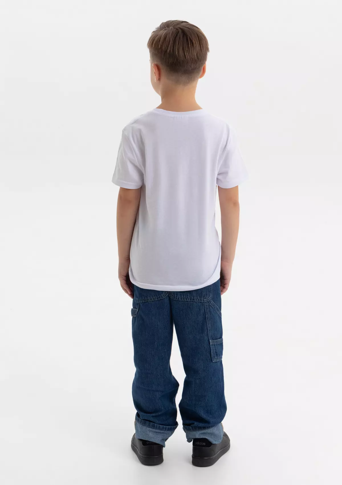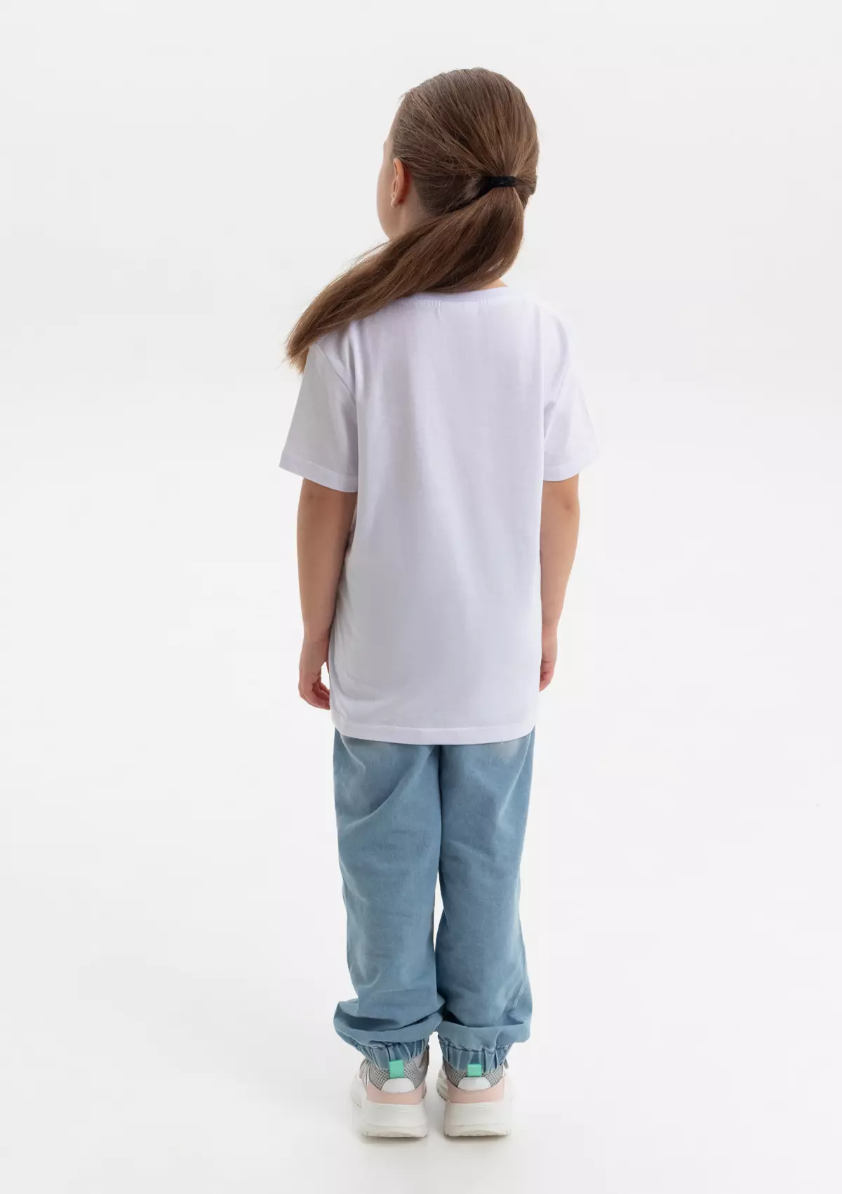 Детская футболка свободного силуэта с округлым воротом и втачным рукавом. Плечевые швы и шов горловины спинки усилены настрочной бейкой из основного полотна.