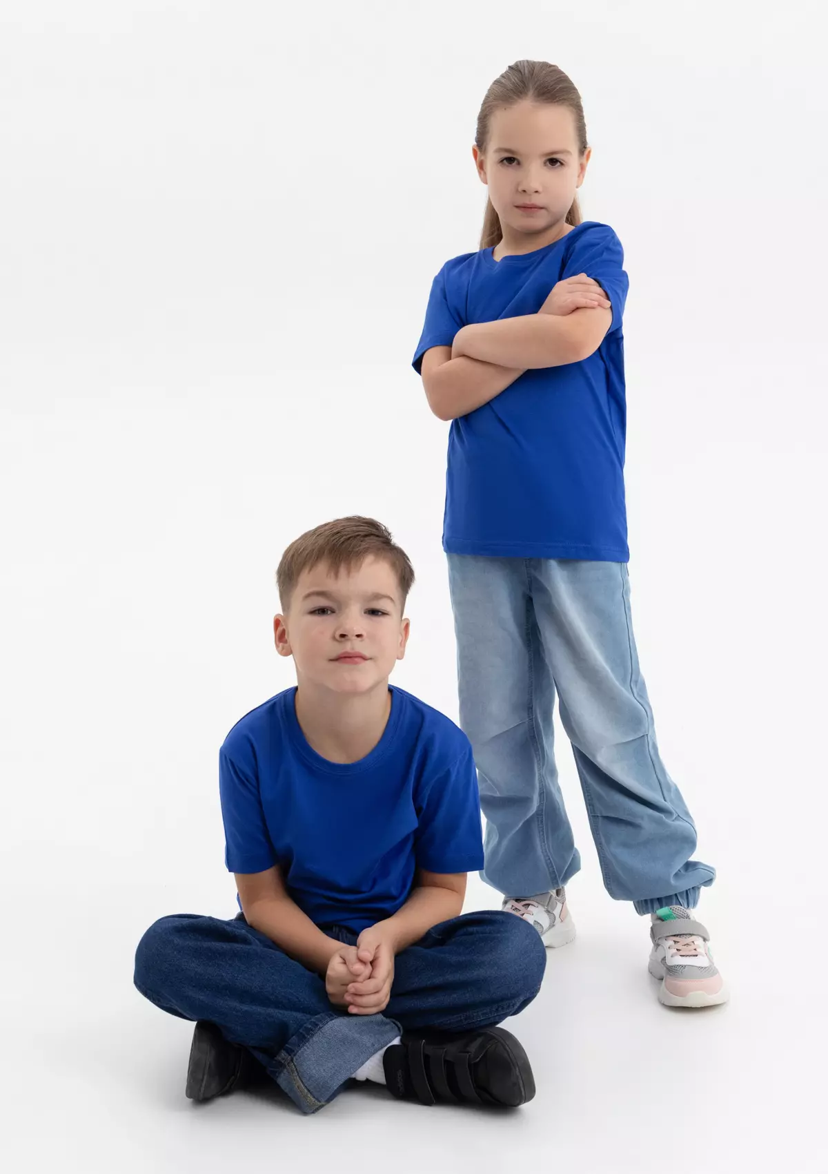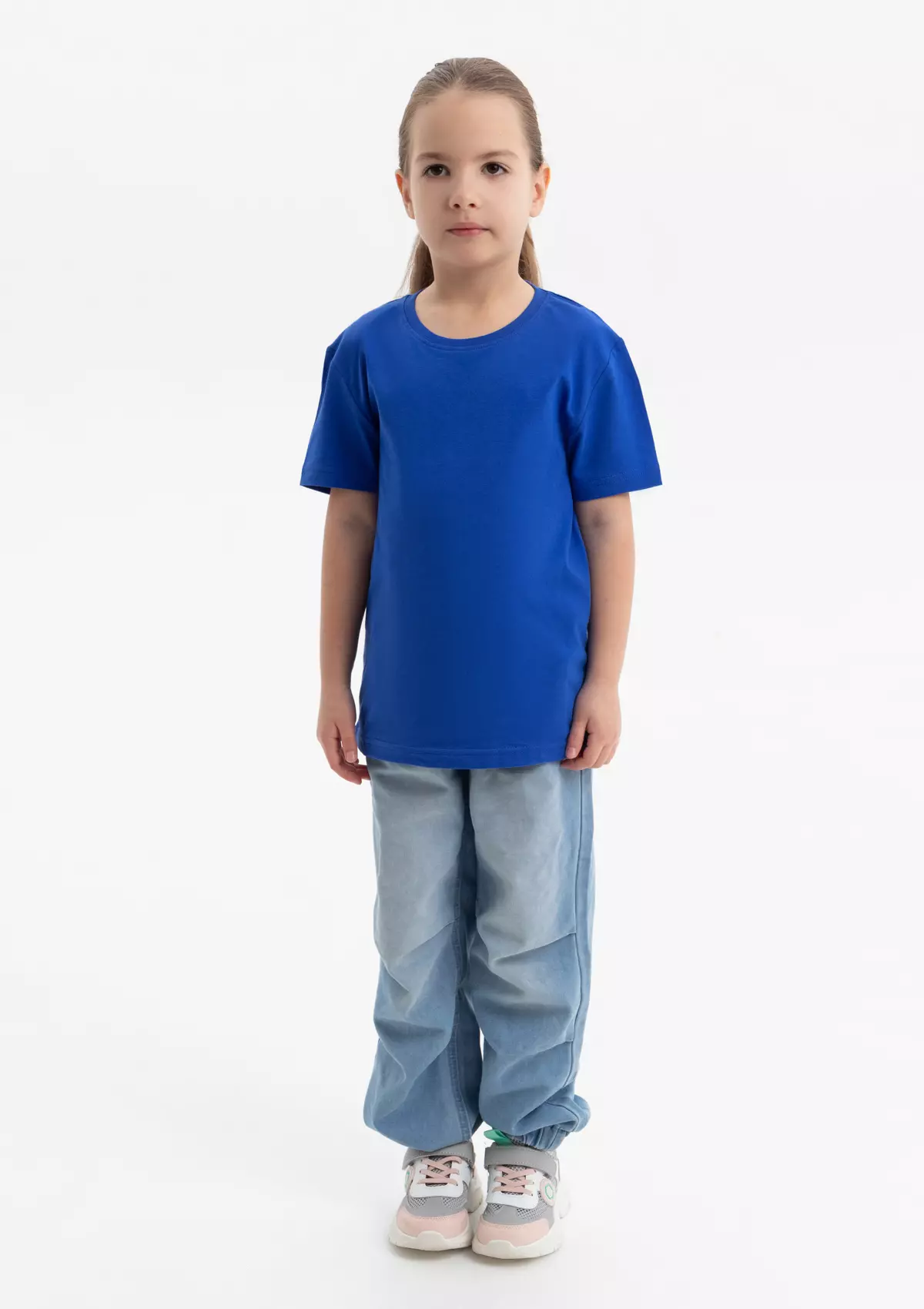 Детская футболка свободного силуэта с округлым воротом и втачным рукавом. Плечевые швы и шов горловины спинки усилены настрочной бейкой из основного полотна.
