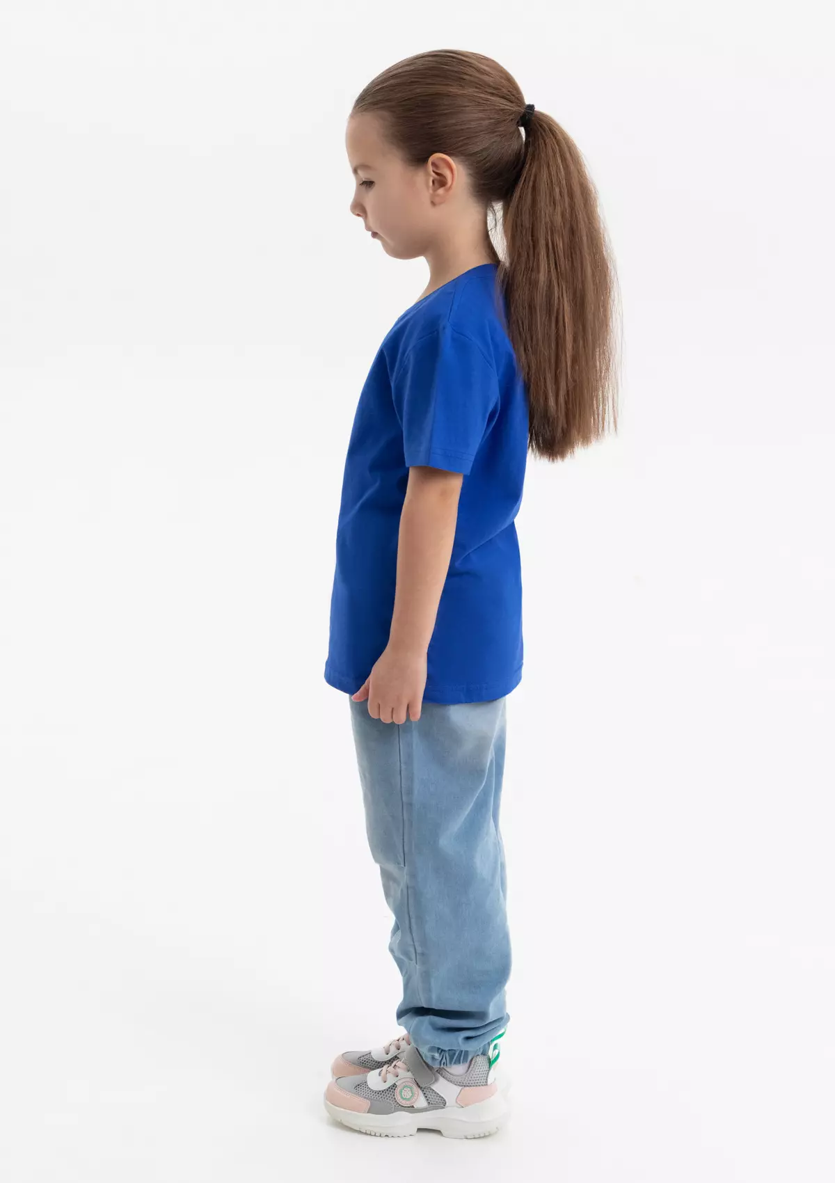 Детская футболка свободного силуэта с округлым воротом и втачным рукавом. Плечевые швы и шов горловины спинки усилены настрочной бейкой из основного полотна.