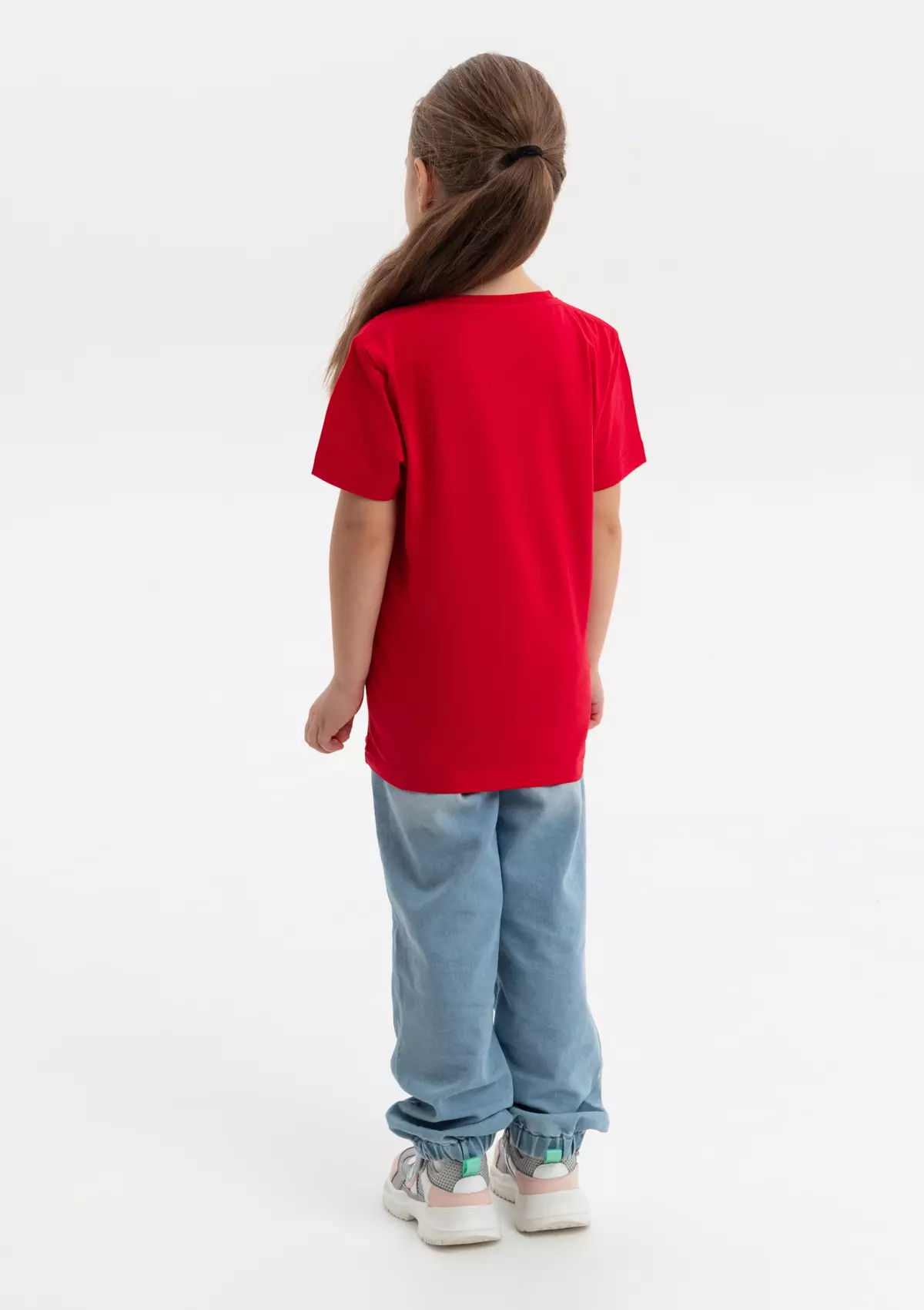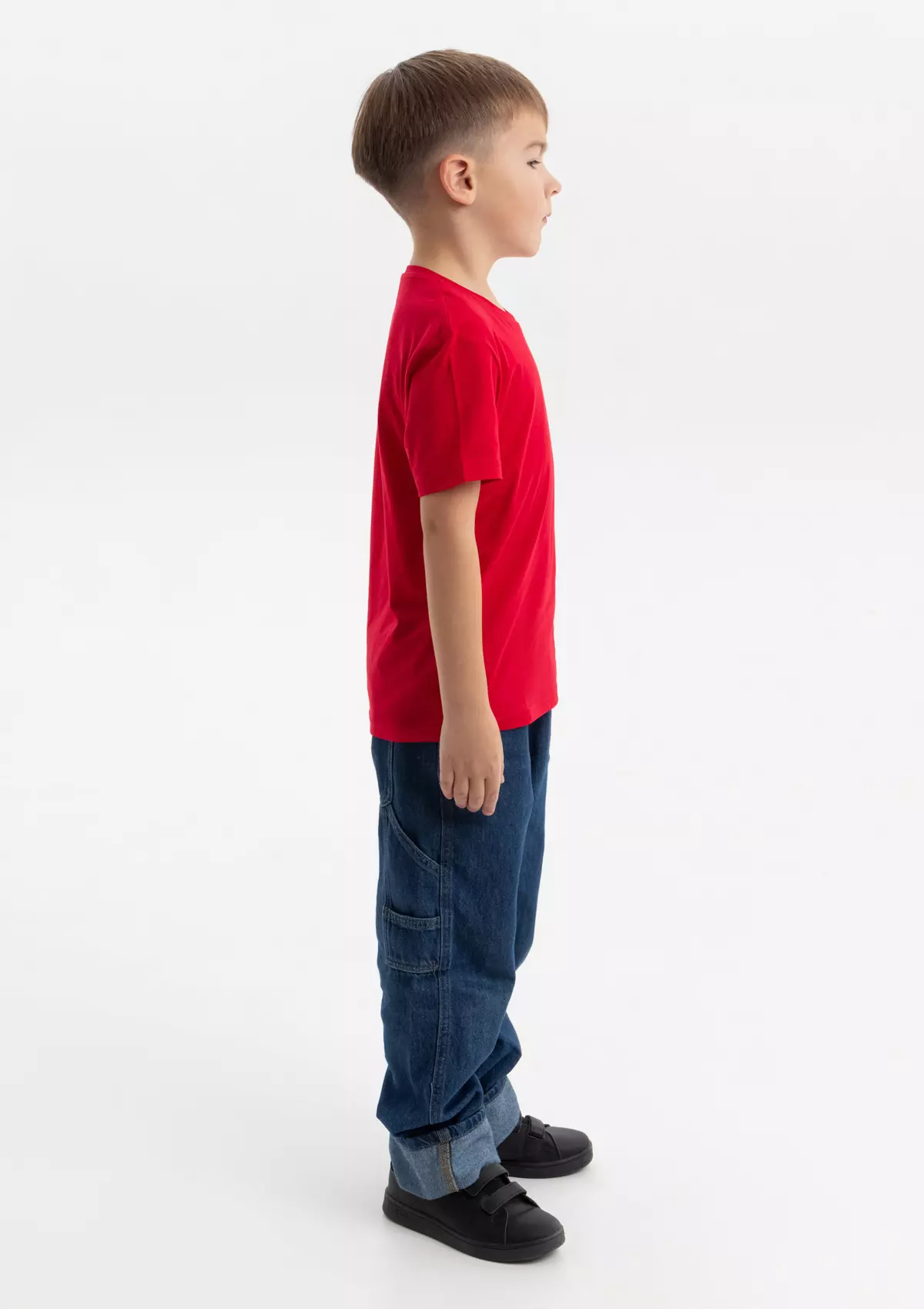 Детская футболка свободного силуэта с округлым воротом и втачным рукавом. Плечевые швы и шов горловины спинки усилены настрочной бейкой из основного полотна.
