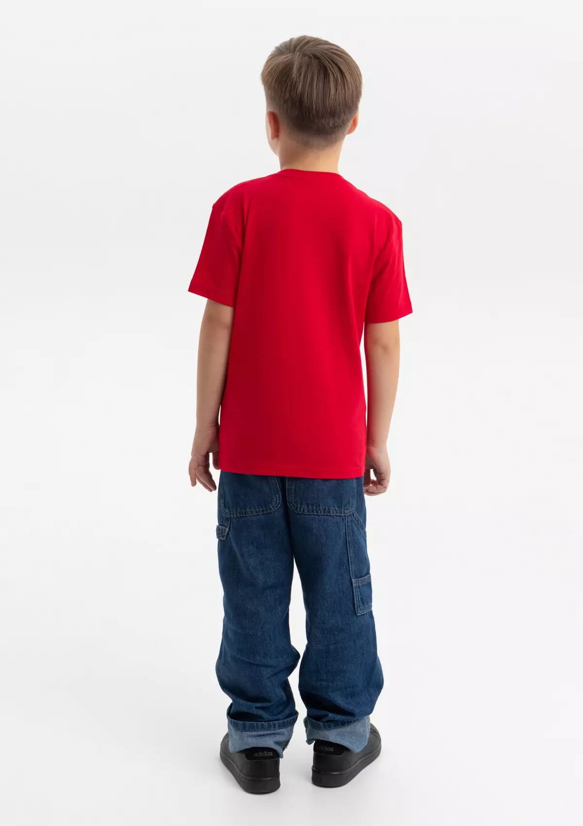 Детская футболка свободного силуэта с округлым воротом и втачным рукавом. Плечевые швы и шов горловины спинки усилены настрочной бейкой из основного полотна.