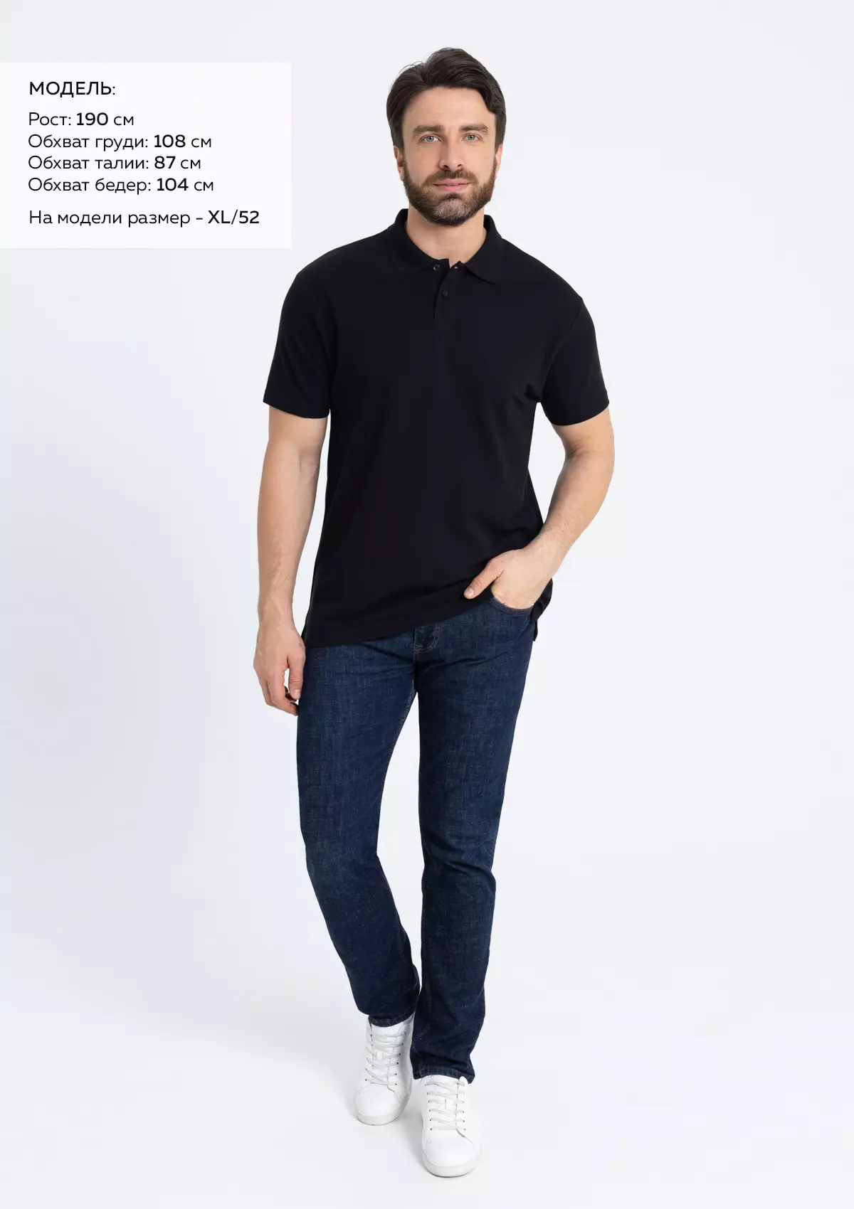 Размер на модели: XL/52. Параметры модели: рост 190 см.; обхват груди 108 см.; обхват талии 87 см.; обхват бедер 104 см.