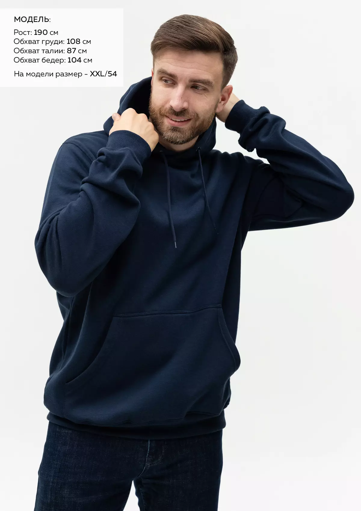 Размер мужского худи: XXL/54. Параметры модели: рост 190 см.; обхват груди 108 см.; обхват талии 87 см.; обхват бедер 104 см.