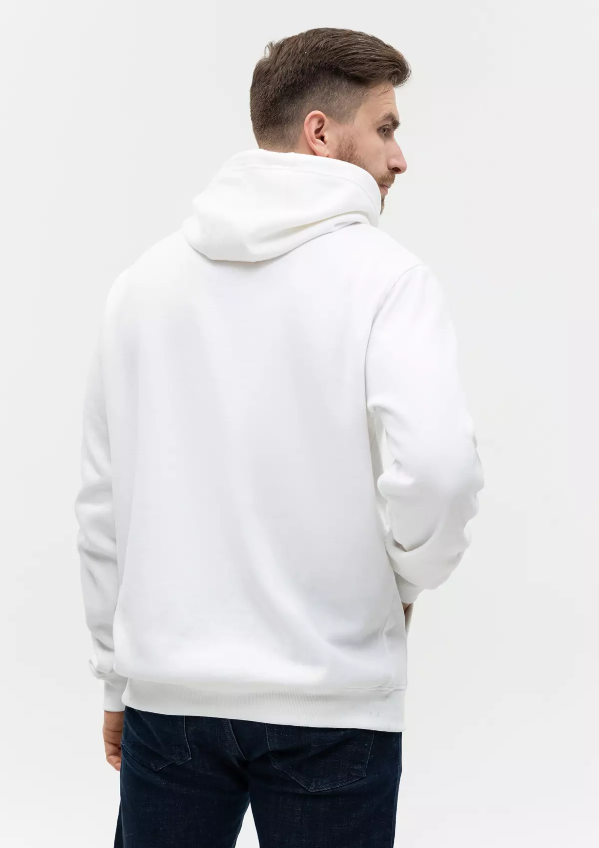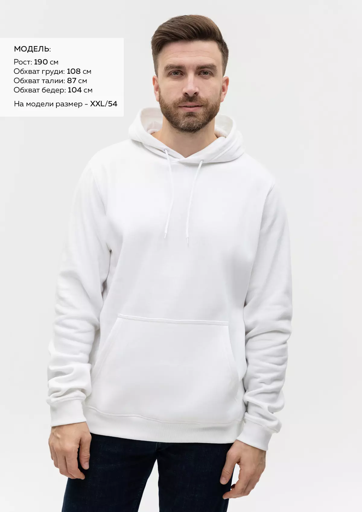 Размер мужского худи: XXL/54. Параметры модели: рост 190 см.; обхват груди 108 см.; обхват талии 87 см.; обхват бедер 104 см.