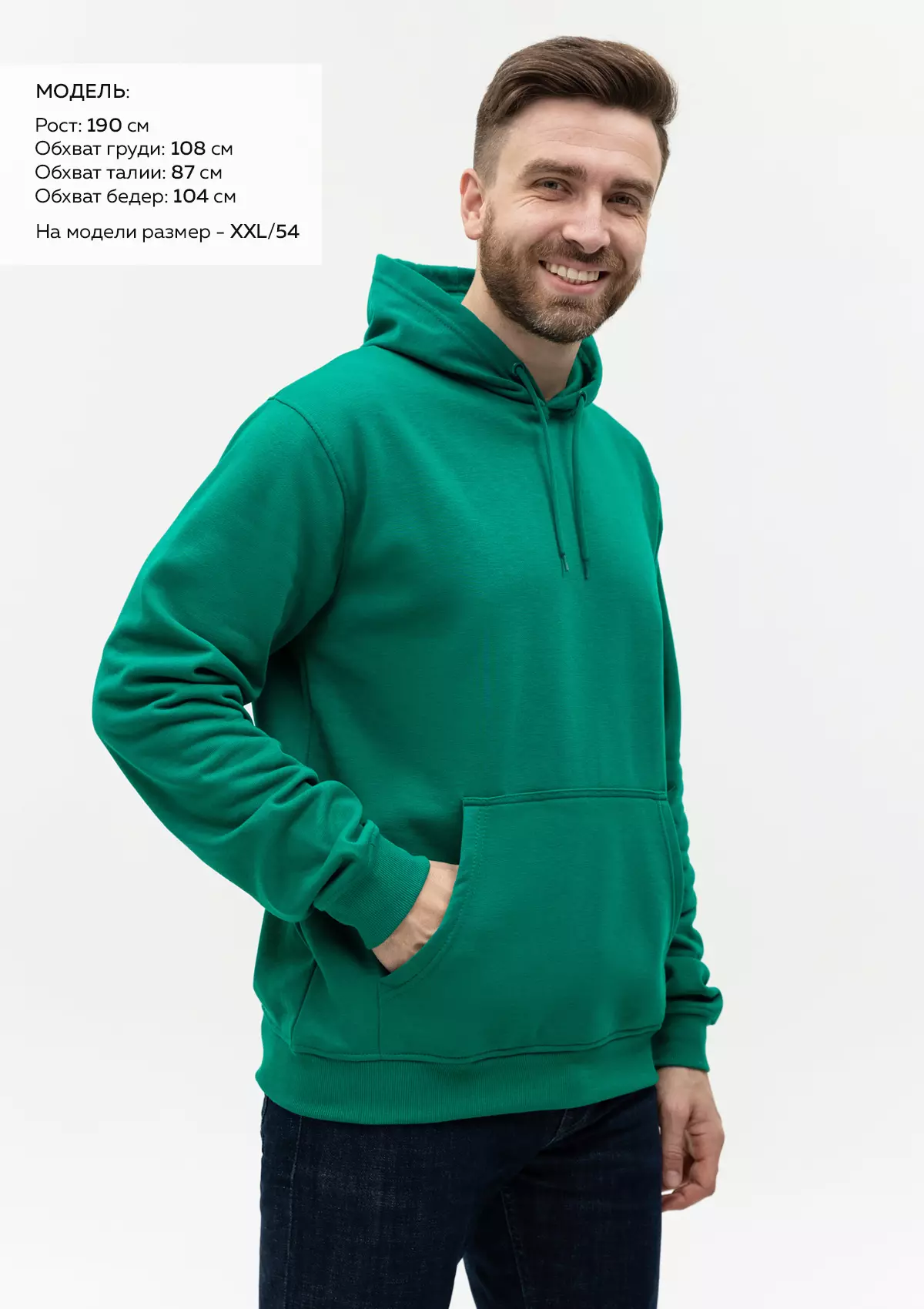 Размер мужского худи: XXL/54. Параметры модели: рост 190 см.; обхват груди 108 см.; обхват талии 87 см.; обхват бедер 104 см.