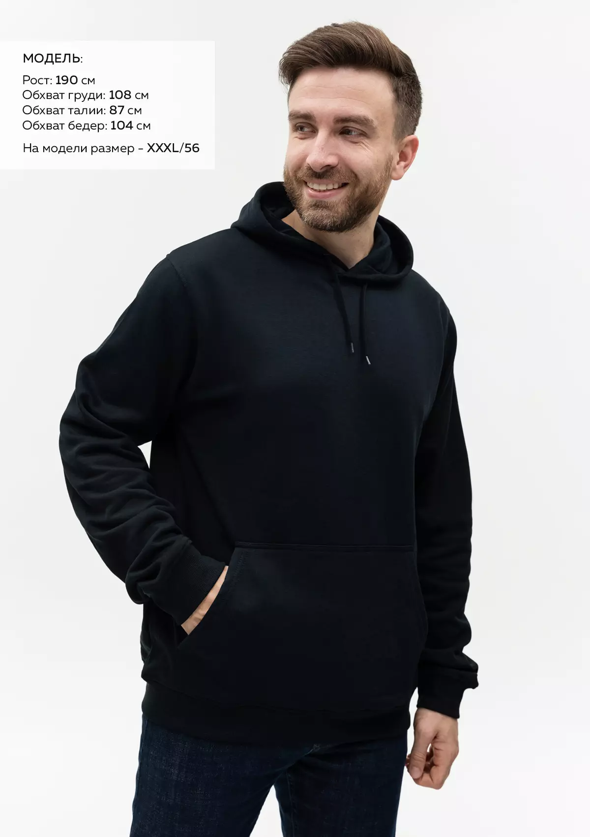 Размер мужского худи: XXL/54. Параметры модели: рост 190 см.; обхват груди 108 см.; обхват талии 87 см.; обхват бедер 104 см.