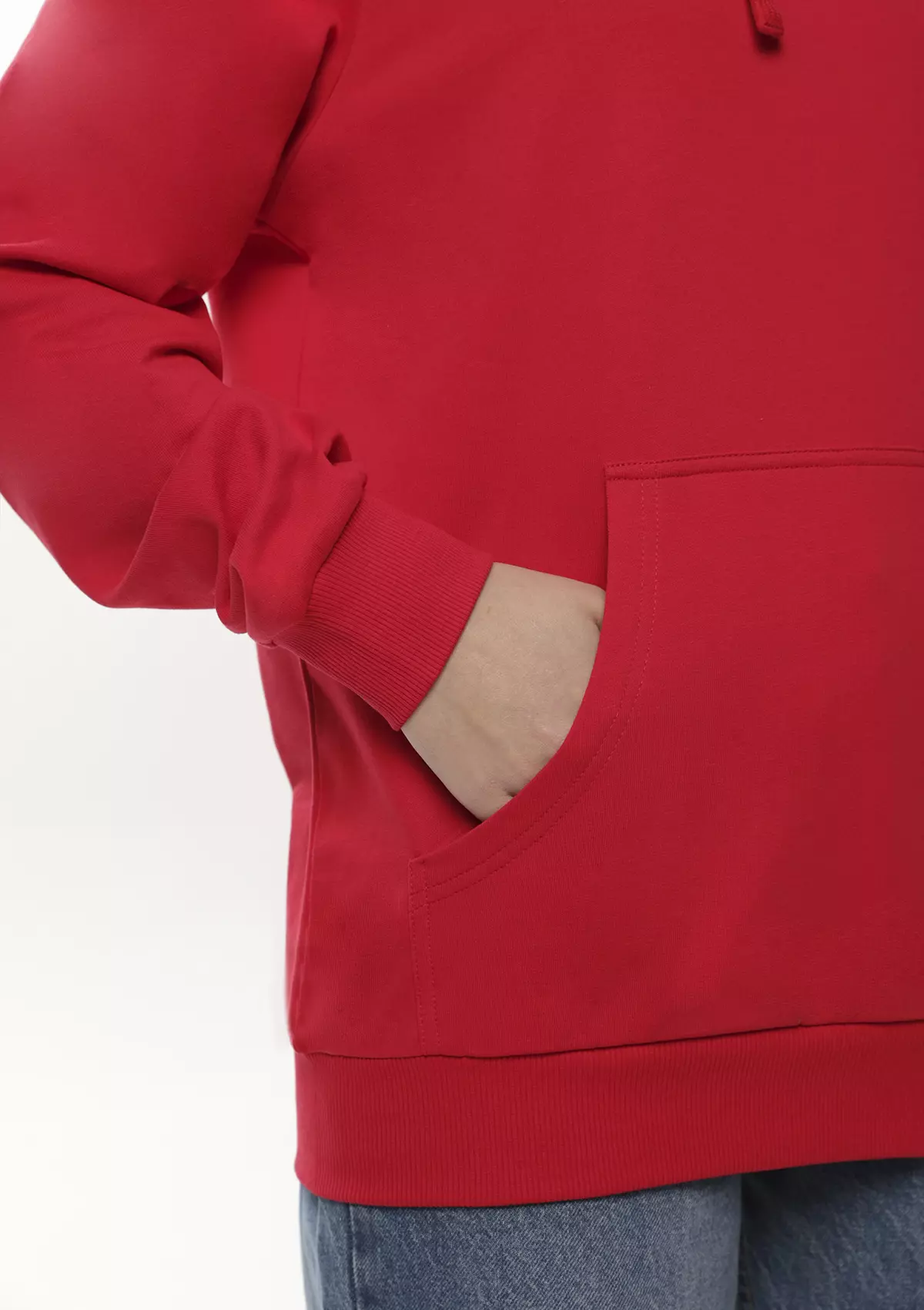 Толстовка прямого силуэта с капюшоном, втачным рукавом и карманом-кенгуру. Капюшон дополнен шнурком для регулирования прилегания, манжет и низ изделия оформлены широкой эластичной резинкой. Возможно два варианта исполнения: контрастные шнурок и бейка/шнурок и бейка в цвет толстовки.